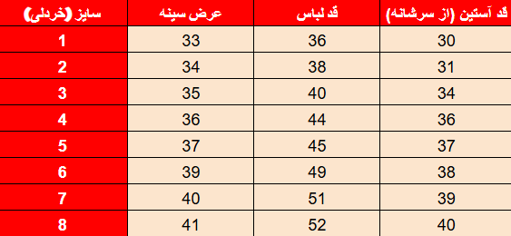 جدول سایز‌بندی: