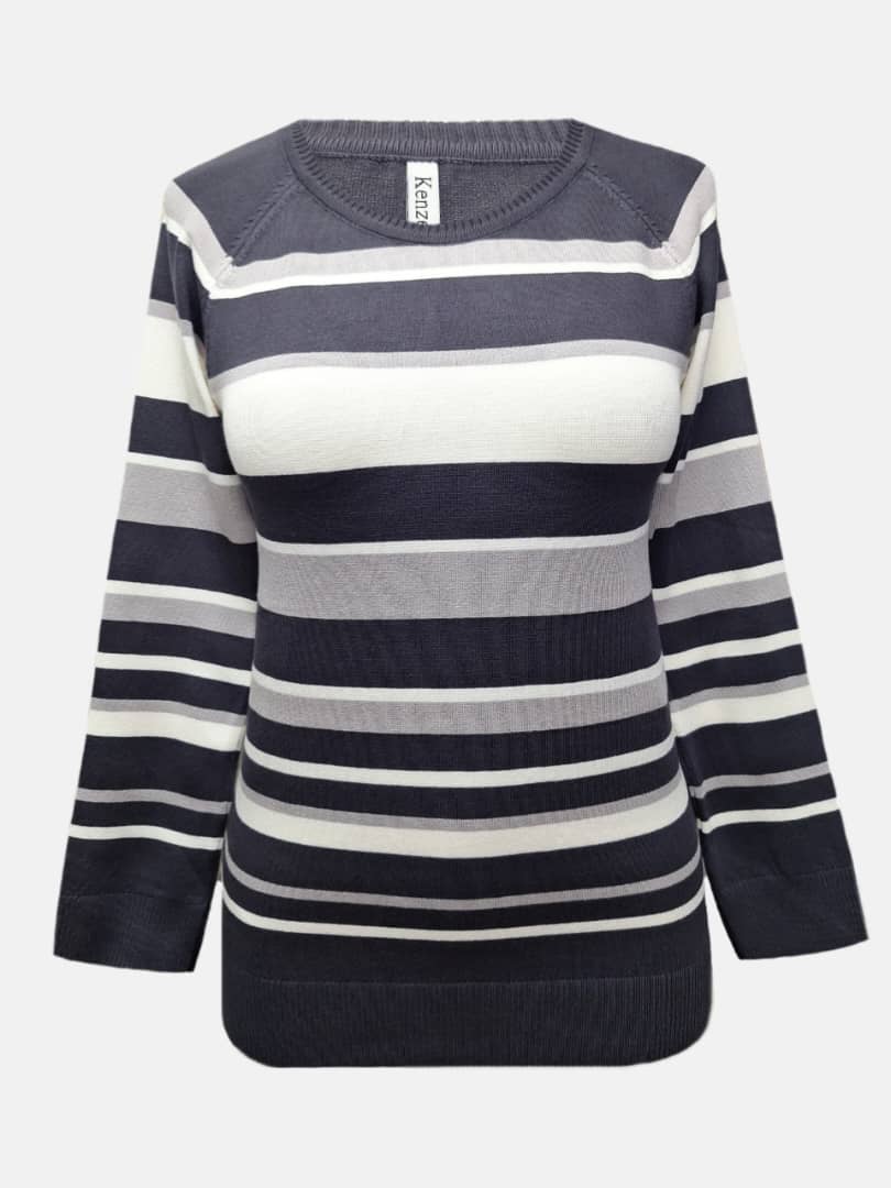 🧣یقه گرد، آستین بلند، طرح پارچه بافتِ راهراه (پهن و باریک)