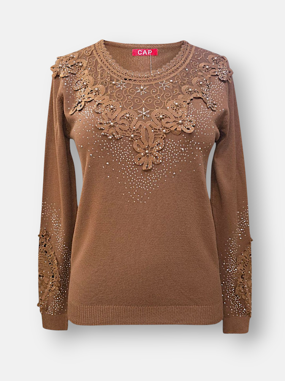 • یقه گرد کارشده با گیپور و نگین