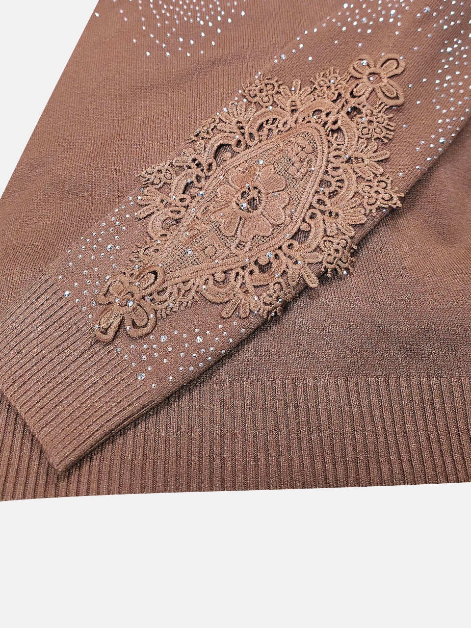 • آستین بلند دارای طرحی چشم‌نواز با گیپور