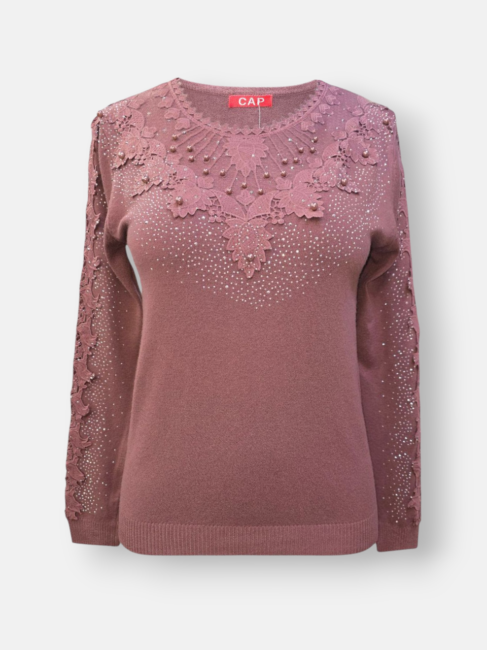 • یقه گرد کارشده با گیپور و نگین