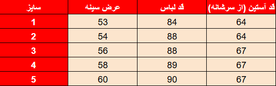 جدول سایز‌بندی: